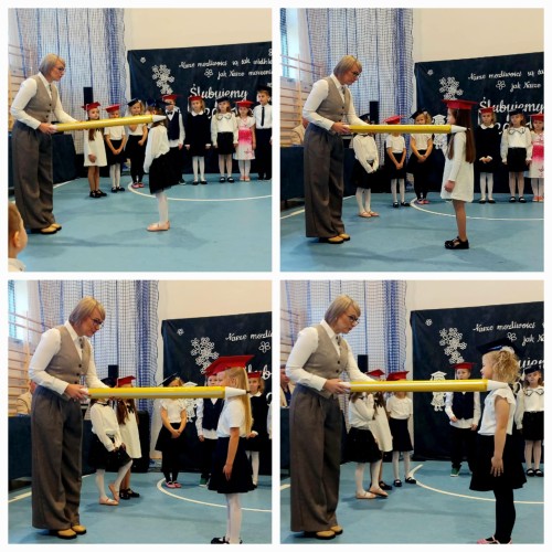 Ceremonii pasowania na ucznia Publicznej Szkoły Podstawowej w Szczecnie dokonała Pani Dyrektor Monika Janus, jednocześnie życzyła wszystkim wielu sukcesów i radości ze zdobywanej wiedzy.
